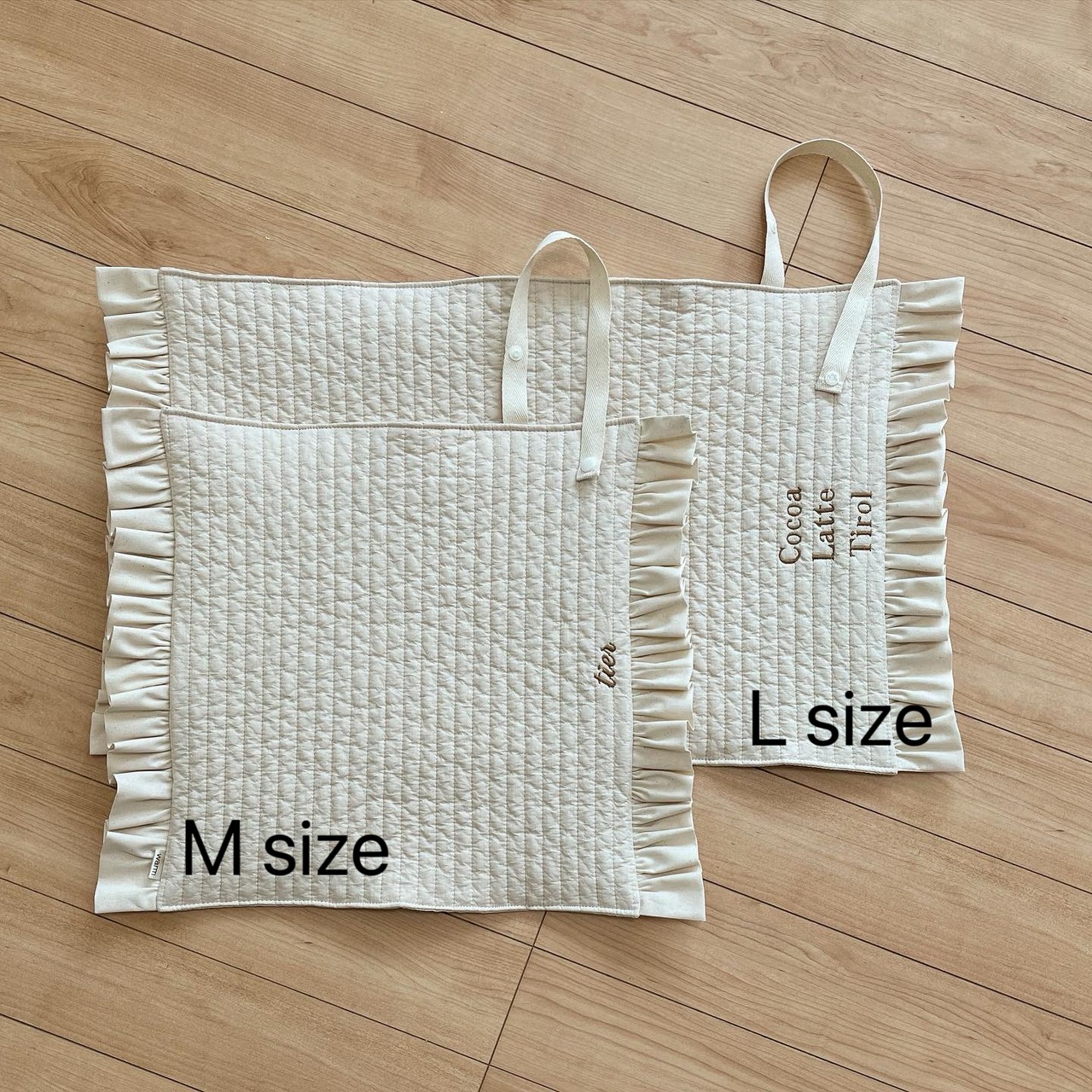 カフェや公園のベンチ、カートやキャリーのマットとしてもお使いいただけます。紐で止めれて落下防止。持ち運びもラクラク。