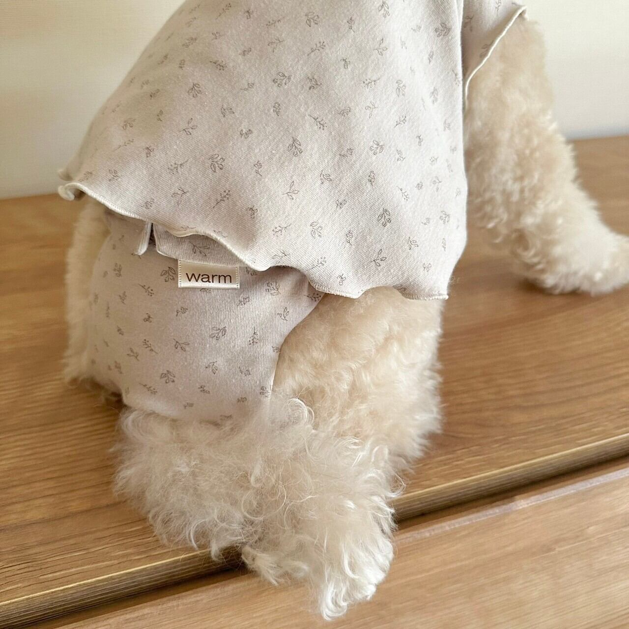 『ぱんつの中でうんちが丸まって毛が汚れてしまう』というお悩みを多く頂き、肛門周りはオープンになっています。肛門下部分の生地はわんちゃんがお尻に違和感を感じないよう、あえてパイピングを施さず生地の柔らかさを残しています。尻尾まわりのパイピングは安心のオーガニックコットンを使用。ふんわりと包み込むようなやさしいおぱんつです。