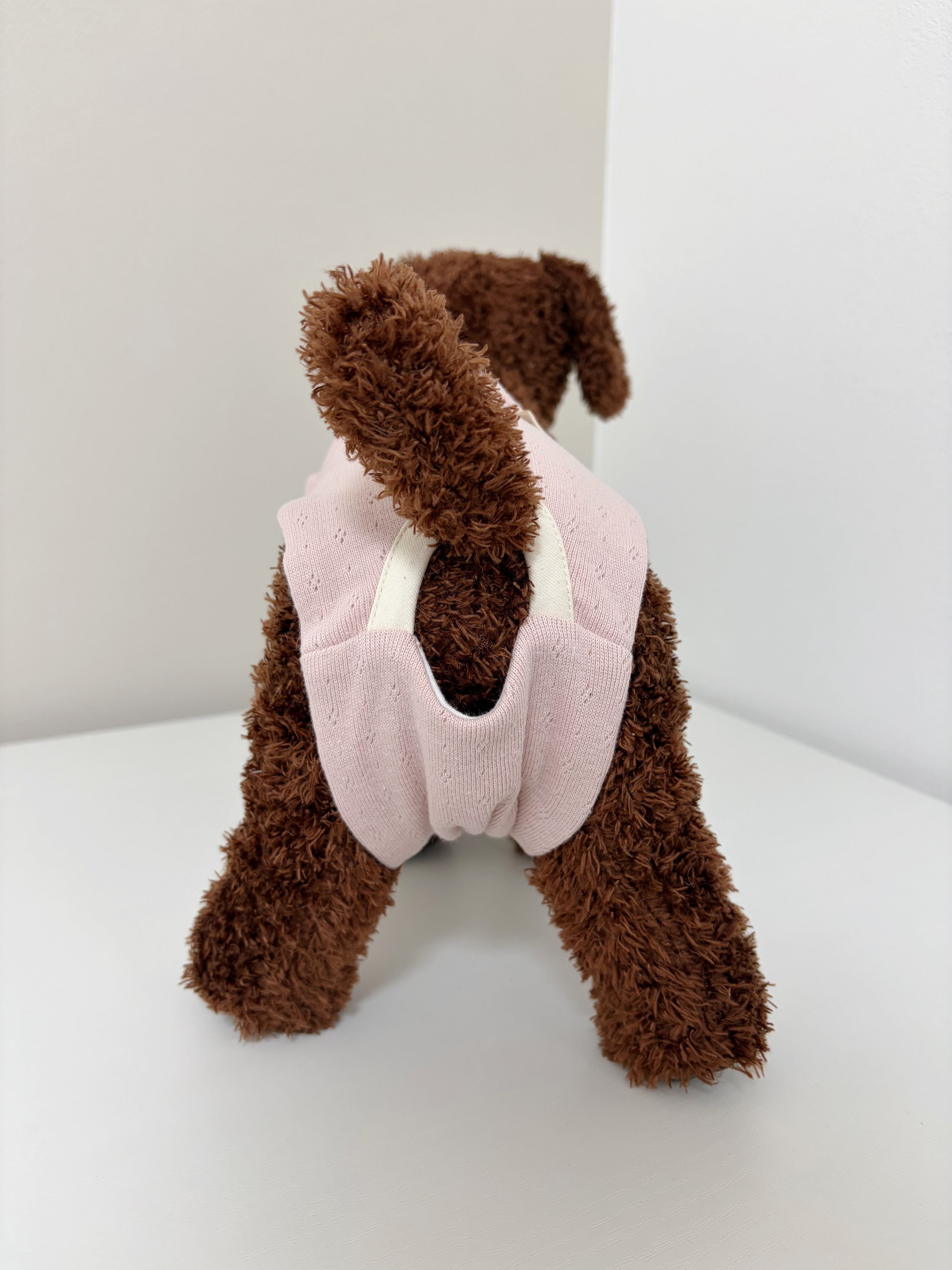 『ぱんつの中でうんちが丸まって毛が汚れてしまう』というお悩みを多く頂き、肛門周りはオープンになっています。肛門下部分の生地はわんちゃんがお尻に違和感を感じないよう、あえてパイピングを施さず生地の柔らかさを残しています。尻尾まわりのパイピングは安心のオーガニックコットンを使用。ふんわりと包み込むようなやさしいおぱんつです。